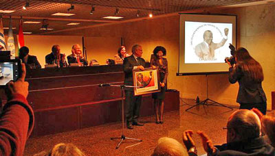 The Vice-President of the Uruguayan Postal Service, Ms Solange Moreira, handed an enlarged framed copy of the Nelson Mandela stamp issued last year to commemorate the Year of Afro-descendants to the Head of Mission, Ambassador Dawie Jacobs at the event.