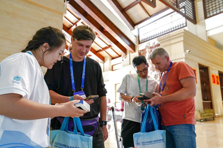 Guests and staff members communicate at the venue of Global South Media and Think Tank Forum 2025 in Kunming, southwest China's Yunnan Province, Sept. 5, 2025. (Xinhua/Peng Yikai)