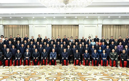 Chinese President Xi Jinping, also general secretary of the Communist Party of China Central Committee and chairman of the Central Military Commission, poses for a group photo while meeting with representatives of local officials at various levels and from various departments in Urumqi, northwest China's Xinjiang Uygur Autonomous Region, Sept. 23, 2025. (Xinhua/Yan Yan)