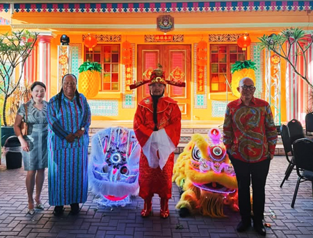 Pictured (l-r) Jennifer Cheng Mantaha, Dr Naledi Pandor and High Commissioner Zainal Arif Mantaha with the Lions and God of Fortune (photo: TDS) |