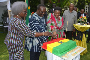 High Commissioner Ahwoi(centre), Mrs Ahwoi and Minister Bathabile Dlamini of Social Development for South Africa pictured cutting the Independence cake.