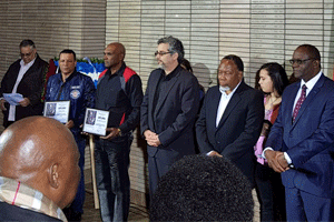 Photo: Cuban Ambassador Benitez Verson, Former President of SA Kgalema Motlanthe and Ambassador of Namibia Veiccoh K. Nghiwete give Diplomas to Cubans who fought for the liberation of Africa.