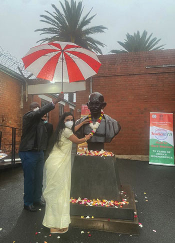 Photo: Consul General Anju Ranjan at Constitution Hill garlanding the bust of Gandhi (Photo: twitter)