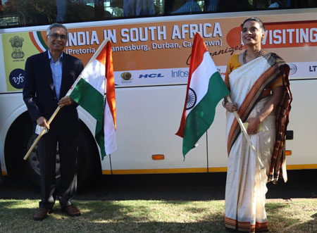 Indian High Commissioner Jaideep Sarkar and Indian Consul General in Johannesburg Anju Ranjan flagging off the bus as the Gandhi Trail begins (Photo: twitter)