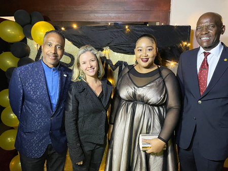 From (l-r) - Founder of NOSACONN and Director of NOSACONN VNB, Damon J. Batiste (first cousin to GRAMMY Album of the Year winner, Jon Batiste) of New Orleans Royal Family of Music, , Candice Dawkshas (COO of Virtual Nation Builders) and Director of NOSACONN VNB, Her Royal Highness Queen Sekhothali Mabhena and His Majesty King Makhosoke II of the Amandebele Nation at the epic GRAMMY Celebration in South Africa.