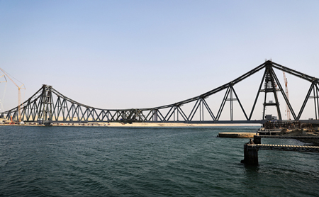 A swing bridge over the Suez Canal renovated by Chinese companies completes a docking test in Ismailia, Egypt, on June 5 (XINHUA)