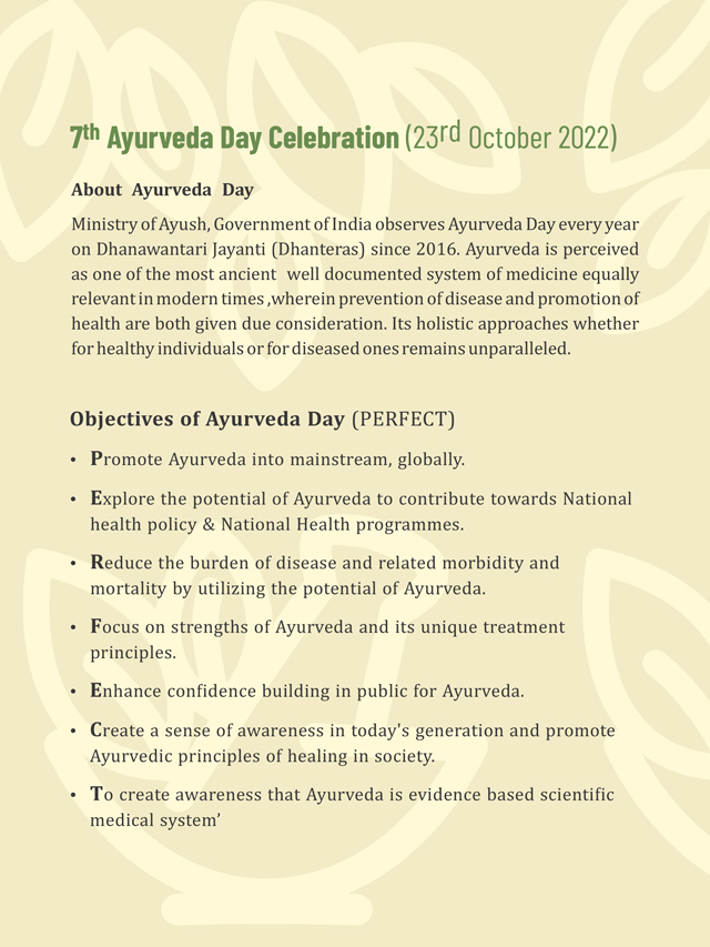 National Ayurveda Day is observed on the occasion of Dhanwantari Jayanti (Dhanteras) every year since 2016. The 7th National Ayurveda day this year was celebrated on 23 October and it aimed to introduce Ayurvedic principles of healing to the younger generation and to establish awareness among them. This year India celebrated Ayurveda Day under the theme of “Har Din Har Ghar Ayurveda”.