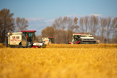 Agricultural machines work in fields at a farm of Beidahuang Group in northeast China's Heilongjiang Province, Oct. 12, 2024. (Xinhua/Zhang Tao)