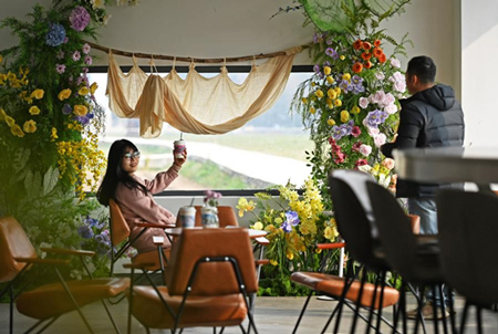 A tourist poses for photos at a cafe in Meirong Village of Tonglu County, east China's Zhejiang Province, Dec. 3, 2024. (Xinhua/Lu Zhe)