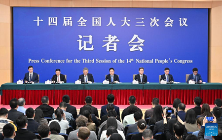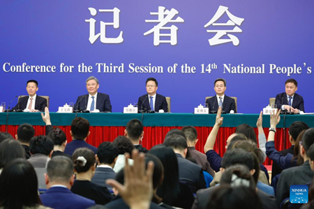 Zheng Shanjie, head of the National Development and Reform Commission, Lan Fo'an, minister of finance, Wang Wentao, minister of commerce, Pan Gongsheng, governor of the People's Bank of China, and Wu Qing, chairman of the China Securities Regulatory Commission, attend a press conference on economy for the third session of the 14th National People's Congress (NPC) in Beijing, capital of China, March 6, 2025. (Xinhua/Zhang Yuwei)