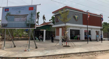 This photo taken on May 12, 2024, shows the Cambodia-China Friendship Multipurpose Building in Tanorn village, Bati district of Takeo province, Cambodia. Once a poor, isolated and quiet village in Cambodia's remote area, Tanorn village has now become a modern one with well-established basic physical infrastructure under a China-aided poverty alleviation project. (Photo by Van Pov/Xinhua)