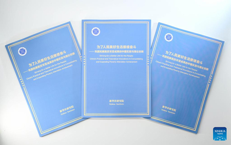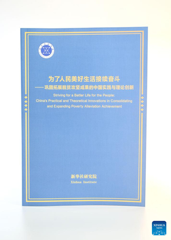 This photo taken on July 9, 2025 shows a report titled "Striving for a Better Life for the People: China's Practical and Theoretical Innovations in Consolidating and Expanding Poverty Alleviation Achievement". Xinhua Institute, a national high-level think tank of Xinhua News Agency, on Friday released the report on China's poverty reduction experience. (Xinhua/Chen Yehua)