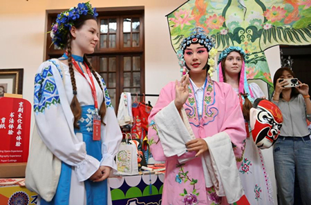 Young students from the Shanghai Cooperation Organization (SCO) countries try on Peking Opera costumes during the Kaleidoscope Cultural Bazaar in north China's Tianjin, Aug. 6, 2025. (Xinhua/Li Ran)
