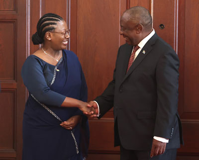 Maria Francesca Mireille Martin, High Commissioner of Mauritius to South Africa presenting her Letter of Credence to President Cyril Ramaphosa on 9 April 2026 (photo: GCIS)