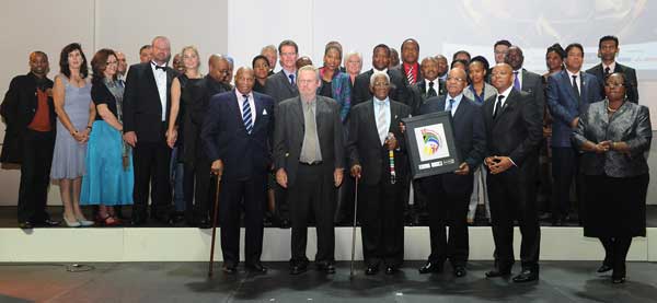 THe winners in the backgound pictured with (l-r) front row Dr Richard Maponya, Minister Rob Davies, Dr. Sam Motsuenyane, President Jacob Zuma, Adv Leslie Sedibe and Deputy Minister Elizabeth Thabethe